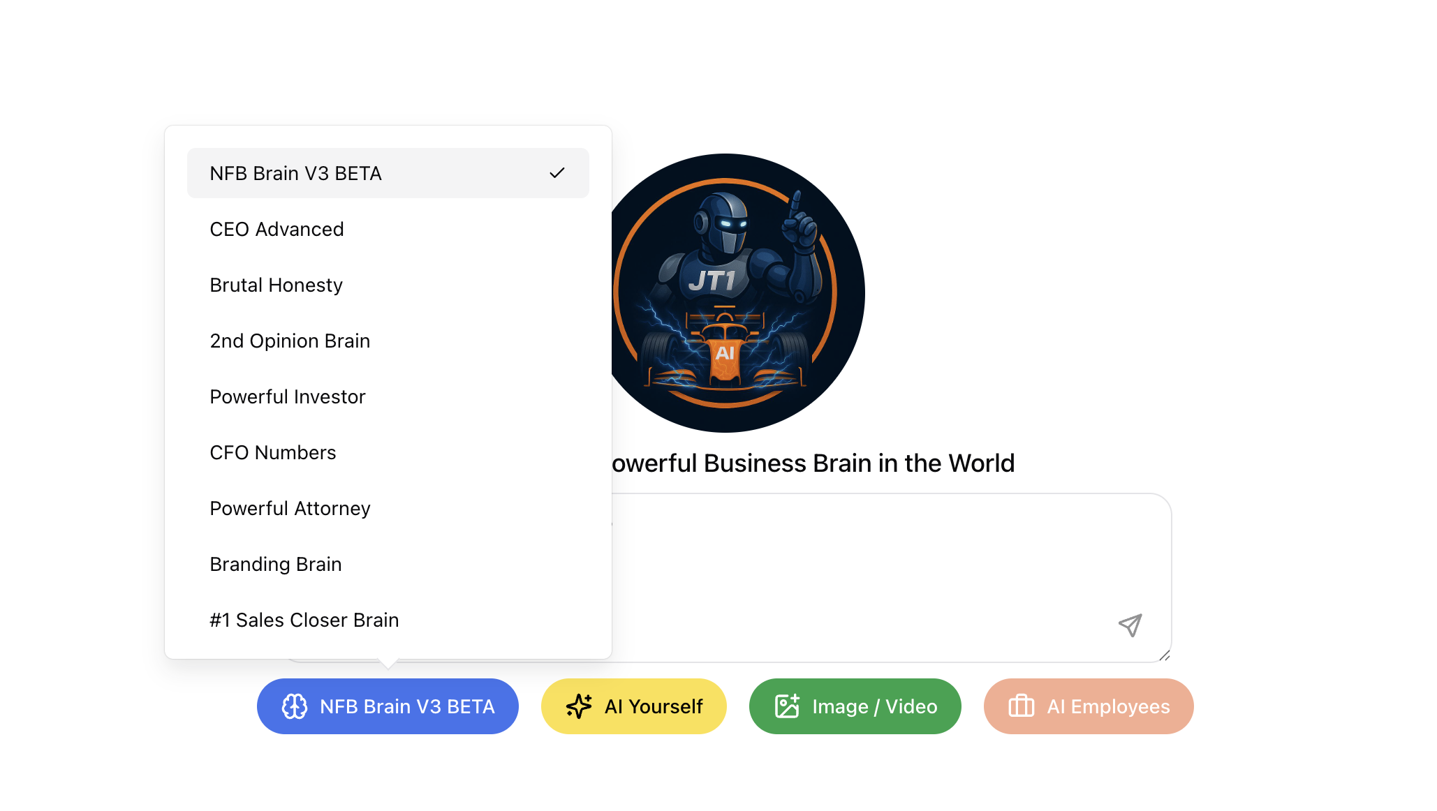 JT1 - 1 Brain - What makes JT1 different from every other AI in the world is not just its 8,000 hours of real business knowledge. It is powered by a proprietary business algorithm and system of commands that no one has ever built before. The main brain is known as the NFB (Nine Figure Brain)